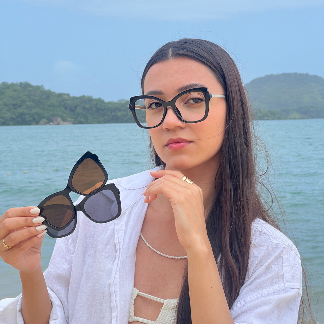 O Clipon 3 em 1 Duna é confeccionado em acetato premium 100% antialérgico, com design quadrado levemente gatinho perfeito para rostos redondos.