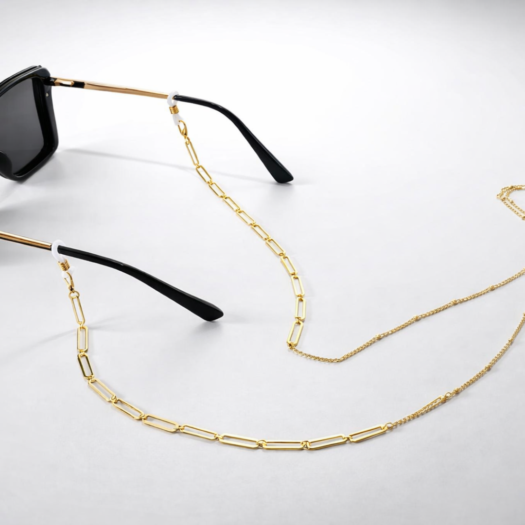 Nosso cordão salva-óculos dourado mantém seu óculos seguro e ainda pode ser usado como colar — um acessório que transforma o clássico em presença.